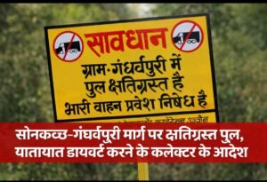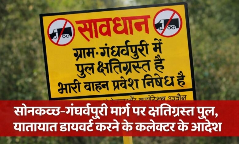 सोनकच्छ।सोनकच्छ–गंधर्वपुरी मार्ग के चैनज 9+100 पर स्थित मध्यम पुल के क्षतिग्रस्त होने के कारण भारी वाहनों सहित सामान्य यातायात को असुरक्षित मानते हुए जिला कलेक्टर एवं जिला दंडाधिकारी देवास ने मार्ग परिवर्तन (डायवर्जन) के आदेश जारी किए हैं। यह व्यवस्था पुल के संधारण/पुनर्निर्माण पूर्ण होने तक प्रभावी रहेगी।